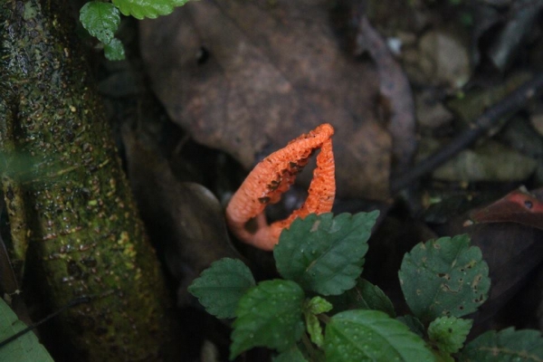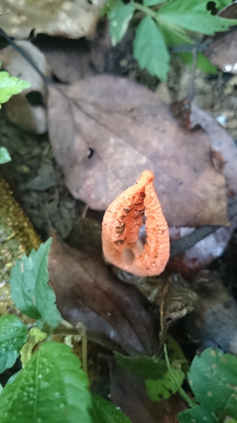 - 子層扥3~4支角臂狀,淡紅色,內覆深褐色孢子黏液物。菌柄短,中生,中空,圓柱形,淡紅色,海綿質