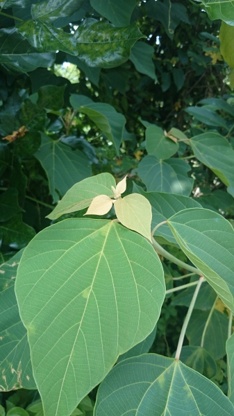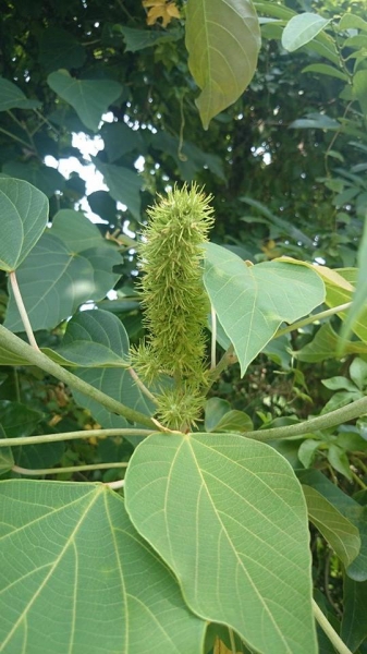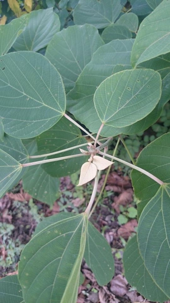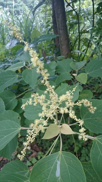 - 嫩葉與芽密生紅褐色絨毛,葉互生,卵形或闊卵形,末端成尾狀,葉表基部有蜜腺,可分泌糖蜜供螞蟻取食,而螞蟻則為它驅除蟲害,形成互利共生的關係