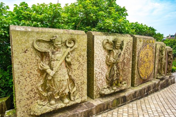 若看見一對銳利、彷彿直透人心的鷹眼,就代表已達道場入口,這雙鷹眼即為最具指標性的「天眼門」,兩側矗立的石柱上還有各國宗教的雕刻圖騰;而進入道場後,首先會看見一尊高12公尺青銅鑄造的黑面金身觀音,赫然醒目,令人肅然起敬;往裡走會經過聞喜堂、客堂、華藏海、佛祖殿等殿堂,還有五百羅漢步道,兩旁的羅漢石雕,尊尊表情神態不同;紅瓦石屋的大殿內有尊全台唯一的玉面左臥佛;道場後山則有條朝山大道,循步道攀升而上,可直抵荖蘭山頂。除此之外,這裡的一大特色便是圍繞在道場邊的53座佛塔-「舍利塔林」,錯落在一片綠意盎然之中,若是在秋季時節造訪,還能看到這裡獨有的「塔林芒海」秋日一景。