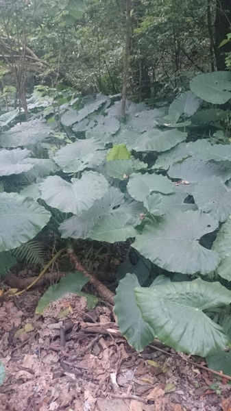 - 半盾狀生或廣卵狀心形,先端銳尖,全緣,長可達 1 公尺,葉柄長,略包莖,葉鞘基部可積水。