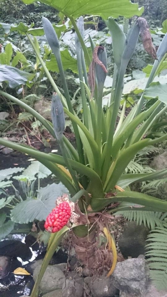 - 佛焰苞肉質,綠色;雌花在下,雄花在上,中央為中性花