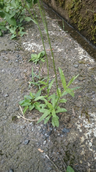 - 單葉,互生或根生,無葉柄;根生葉和下部莖生葉長 2~8 公分,寬 0.3~0.8 公分,匙形至線狀披針形,葉基楔形,葉尖銳形,葉緣疏鋸齒緣;上部葉漸變小