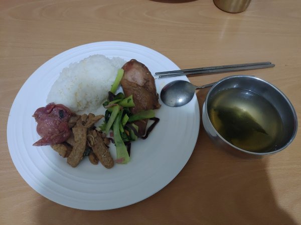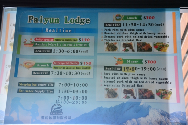 抽中排雲山莊假日床位,狀況良好。建議帶耳塞,以免睡眠被干擾。有向雲豹訂餐,第一天13:00到達排雲已無水可裝,從西峰返回排雲大約17:30,第一桶熱水已快裝完,第二桶要等到晚餐後,第二天01:30已備有熱水,建議若要裝水,動作要快,否則要等第二桶水。