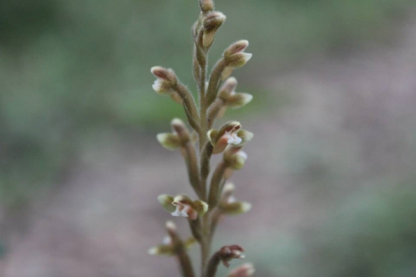 - 頂生穗狀花序花莖有毛,長約20-40公分長,,花苞1.2公分,中萼片和花瓣合生成帽狀,唇瓣具圓柱形矩,矩長約3mm,花期:4-5月