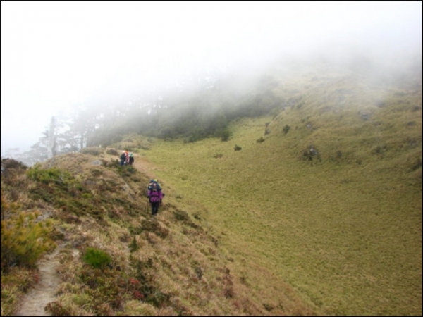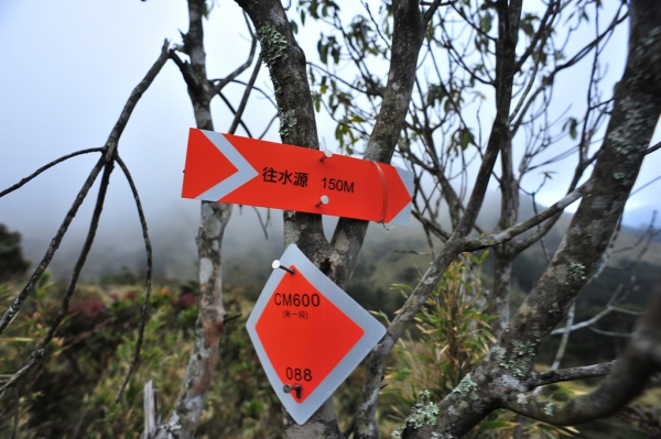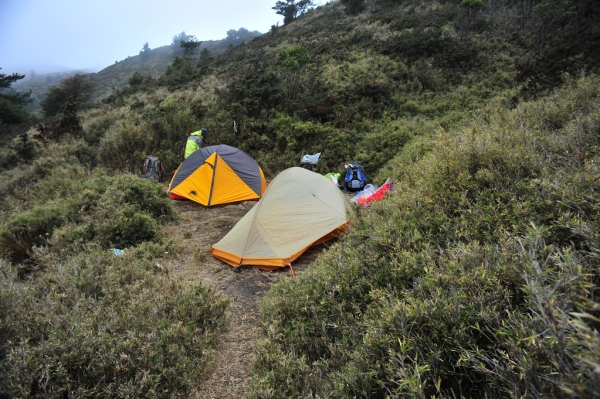 營地有兩部分,一部分較平坦,約可搭一人帳3頂,另外一塊叫斜,兩人帳2-3頂,下切80大樹後可取水,有布條可看,水量少,需用用杯子裝進去水袋
