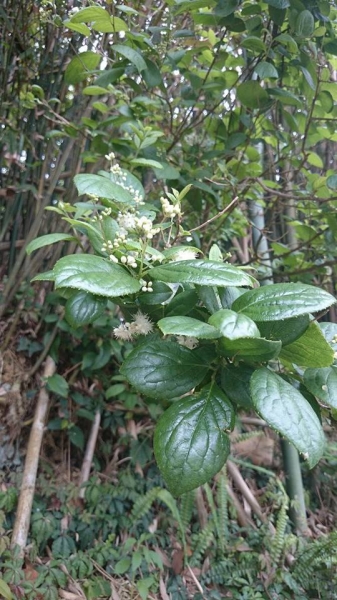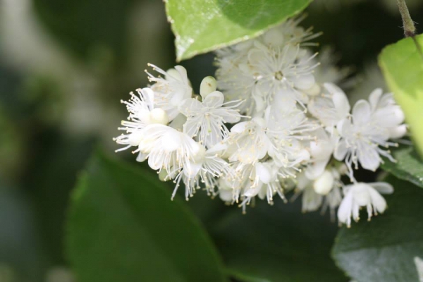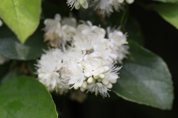 - 圓錐花序頂生,小花數目多而密集,花冠白色,萼五裂,雄蕊多數、細長,分長短 2 型。