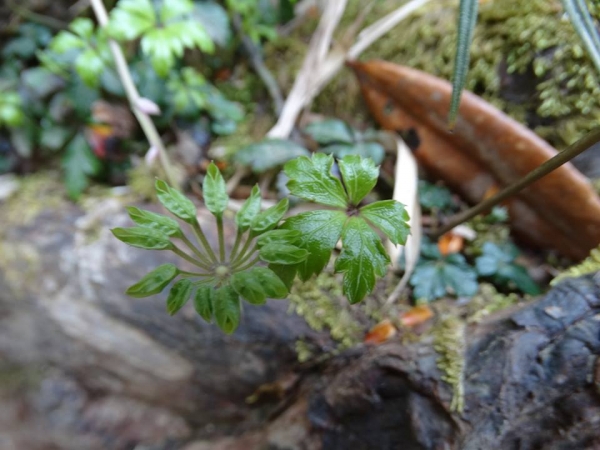 - 葉基生,掌狀深裂,頂生裂片菱形,3或多片淺裂,裂片尖凸鋸齒緣,兩面光滑