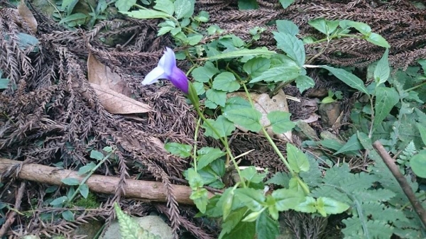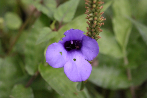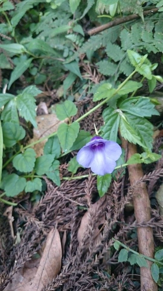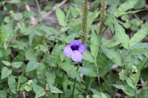 - 總狀花序或單生葉腋,紫藍色,長筒狀,微彎曲,先端不整齊唇狀 4 裂,長約 2.5~3 公分,下唇瓣稍大,先端鈍,內部具黃點
