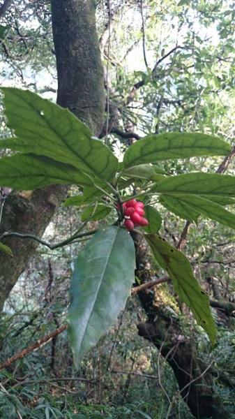 - 單葉對生,革質,外觀類似月桂樹,橢圓形至卵狀長橢圓形,葉面亮綠色,葉背灰綠色,葉緣具2~6對鋸齒或全緣
