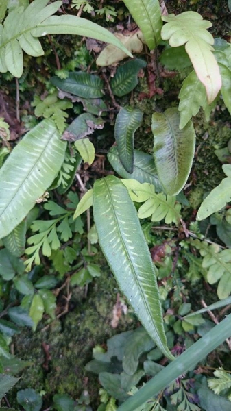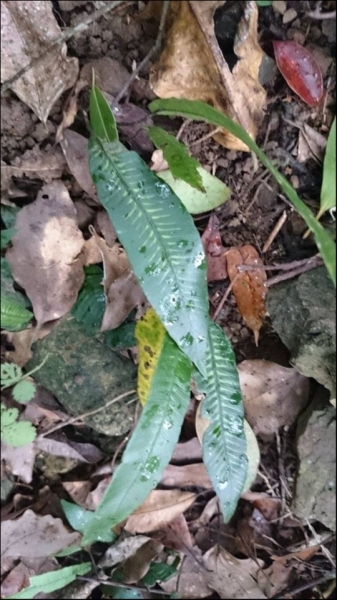 - 單葉,散生;葉柄長 5~15 公分,基部 1~2 公分部分被黑色散生鱗片;鱗片不透明,邊緣細胞常呈厚壁,全緣或具刺狀突起;葉片長 10~25 公分,寬 1~2 公分,長橢圓形,兩端漸尖,邊緣全緣或呈波狀緣,葉片亞革質,葉脈離生,成羽狀分歧,不明顯