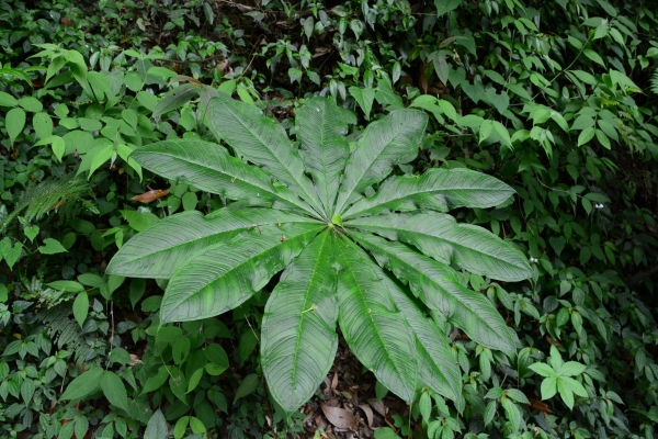 - 葉單生,直立,葉柄如莖狀,具紫黑色斑點;小葉狹橢圓至橢圓形,輪生,先端漸尖,具短尾,上表面綠色,下表面粉白色。