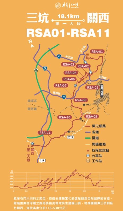 林埤古道入口在櫻花大圳上,雖然古道早已改成水泥階梯,不復原來的古味,不過從老樹下的古老土地公廟「清福祠」,仍可窺見這條古道的歷史。路徑兩旁是草地田疇,終點則設有一座古色古香的八角涼亭,擁有綠色大草原的園區則是水資源保護局。