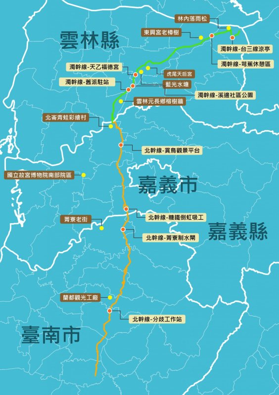 綠道沿途串聯 雲林縣 與 嘉南平原 等重要農業區域,這片約 15 萬公頃的土地不僅是台灣重要糧倉,也是開發歷史最早、人文資源豐富的地區。沿線可造訪多處景點,如 新港奉天宮、林初埤木棉花道、烏山頭水庫、八田與一紀念園區 等,並可近距離觀察水利設施,了解灌溉工程的艱辛歷程,兼具觀光與教育意義。