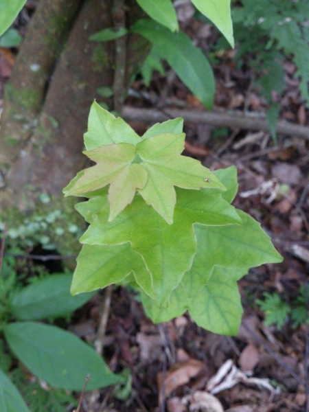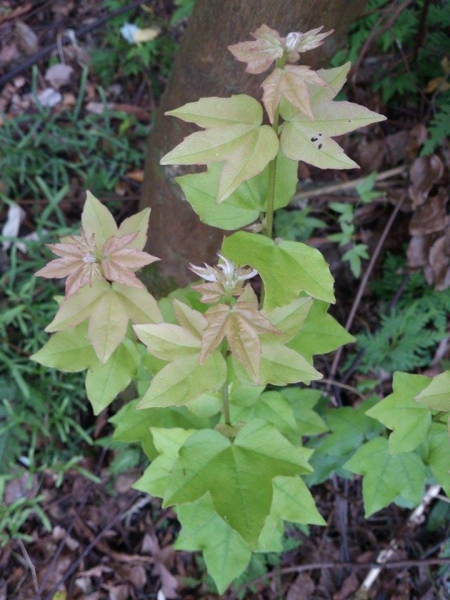 - 掌狀三淺裂葉,革質,對生,全緣或波緣,葉基呈圓形,葉背灰白,葉柄 3~5 公分呈黃綠色,落葉變紅