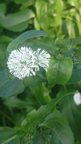 - 花白色,花序頂生,筒狀花多數,聚生頭狀,花下具 1 總苞片;萼片 5 裂,綠色。