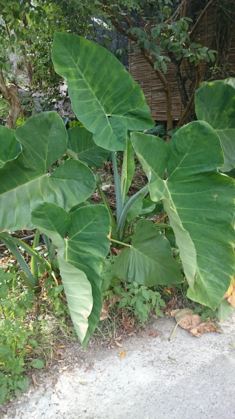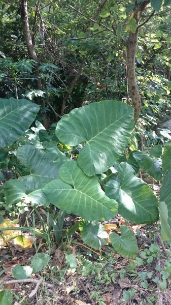 - 葉近基生,大型,心形、戟形、箭形,葉端尾尖,葉基心狀箭形,全緣葉或波狀緣,葉面綠色,具光澤,葉柄綠色