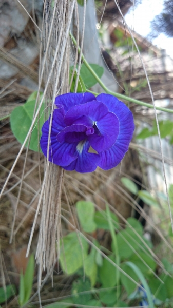 - 花單生,蝶形花冠,腋生,花梗甚短,花冠挺出,鮮藍色或白色,具顏色較淡之點,龍骨瓣內曲,旗瓣特別大,將短小的翼瓣及龍骨瓣包圍在中央近萼筒處,旗瓣中心有漂亮的濃黃斑點