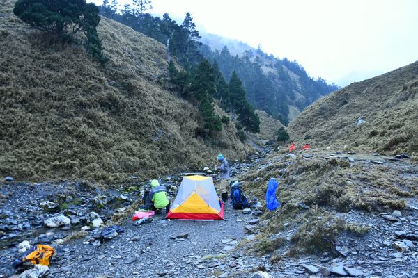 沙土質營地,營地不大 旁邊就是活水源 人多的隊伍續往前30分鐘 可搭 20 歲之湖 風景漂亮 逐水而居 群山環抱