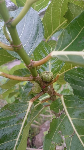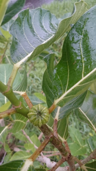 - 扁球形隱花果,葉腋間生長,外表有白色斑點,於表有稜,成熟時黃綠色
