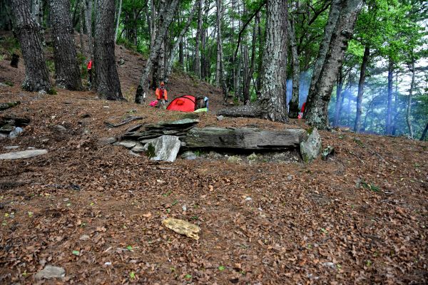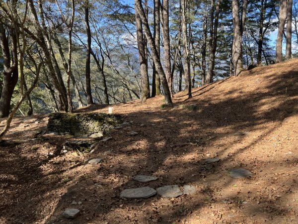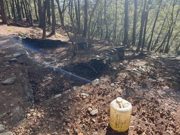 - 二葉松林內石板堆砌的舊遺址紮營,石板屋僅餘三面堆砌的石板牆,中間一間較大