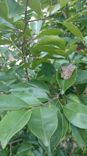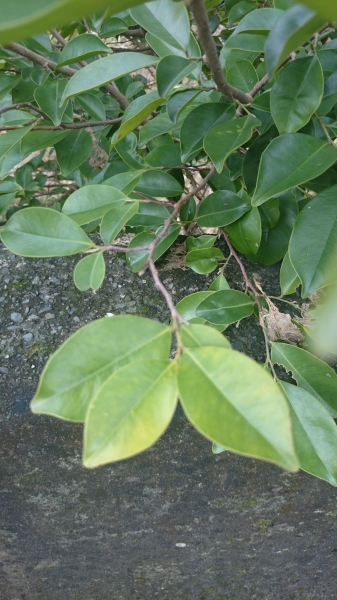 - 葉子互生,近革質,葉子成卵形披針形,先端銳尖,全緣,邊緣鼓起成拱形,正表面翠綠有光澤、細緻,近葉柄處葉脈較粗糙,背面的葉面色澤較淡,長有絨毛