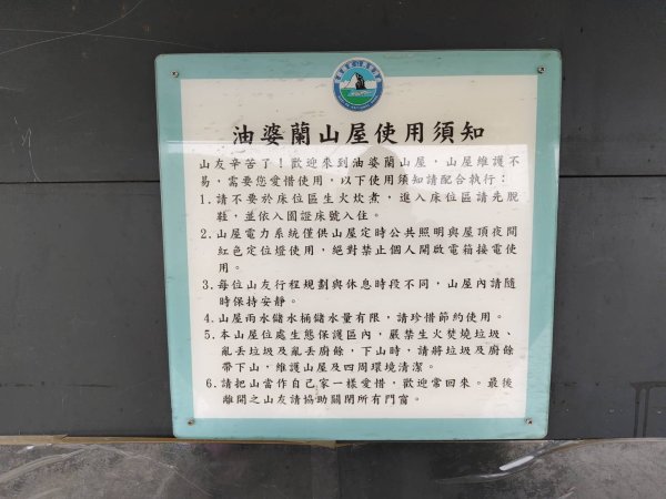 - 1.已放置攜帶型加壓袋艙(PAC) 2.山屋附近油婆蘭池為黑水塘,活水源於劍南山鞍部水源叉路下切溪谷,來回約60分鐘。山屋雖有設置貯水桶,但貯存量適天候與山友使用情況而異,建議山友自行揹水使用。 3.山屋及公廁係為提升山友登山品質與提供緊急避難處所,興建過程及後續維護管理實屬不易,雪管處籲請山友,請遵守垃圾及廚餘自行帶下山的原則,入住期間應保持山屋、廁所及周邊環境整潔,共同維護國家公園珍貴生態景觀與登山服務設施。