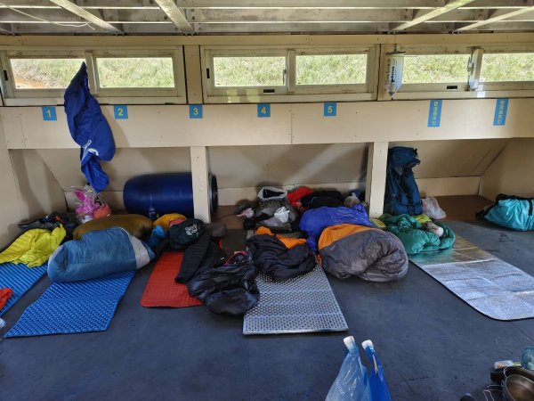 群山環抱的油婆蘭山屋,提供15床位,山屋有兩大蓄水桶,不用再喝咖啡色的池水。