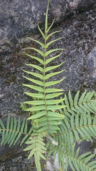 - 葉叢生,葉片長橢圓形,一回羽狀複葉,羽片長線形,,無柄,末端尖,頂羽片顯著,與側羽片同形,下段羽片逐漸縮短,營養羽片之邊緣鋸齒狀,多少朝下反捲