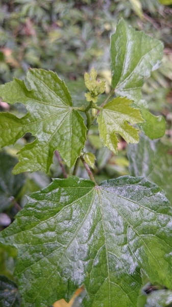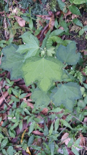 - 葉外形為卵形至圓形,紙質或糙紙質,大多數為三裂,但少數亦有五裂者,邊緣有鋸齒,表面綠色,但有時具有深綠色的斑塊,背面為淡綠色,表裏兩面具有粗毛;葉柄長 1~3 公分,細長,有粗毛
