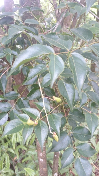 - 奇數羽狀複葉,對生,有托葉,葉柄;小葉對生,5~7 枚,卵至卵狀披針形,,紙質,細鋸齒緣,表面光滑無毛而油亮