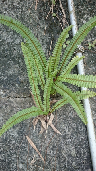 - 一回羽狀複葉,叢生,幼嫩時密被赤褐色毛狀鱗片,,葉軸具縱溝,上部被鱗片葉片長 25~65 公分,寬 2~6 公分,羽狀裂,羽片無柄,羽軸有節,羽片長 1~4 公分,寬 1~2 公分,上下表面近乎光滑,下部羽片鈍形,通常較短,上部羽片著生孢子囊堆,略尖銳,邊緣細鋸齒至細鈍鋸齒。