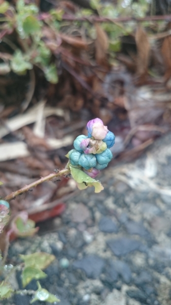 - 總狀花序呈短穗狀,不分枝頂生或腋生;苞片卵圓形,每苞片內具花 2~4 朵。花被 5 深裂,綠白色或帶紫色,花被片橢圓形,長約 0.3 公分,果時增大,呈肉質,深藍色