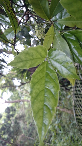 - 複葉三出,展開呈三角形,葉緣呈鋸齒狀,頁面有臘光,每葉長約 4 至 6 公分,呈深綠色