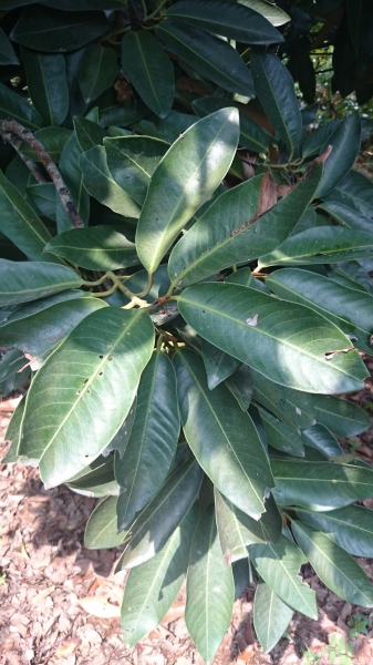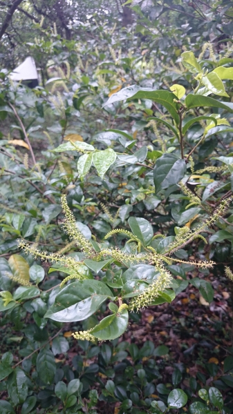 - 葉互生,革質,葉片長橢圓形,通常雌株的葉片較雄株為大。表面深綠色,葉背粉綠色,全緣;側脈表面凹下,背面顯著隆起,兩面無毛。