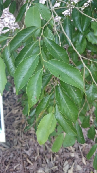 - 葉單生、互生,長橢圓形或長橢圓狀卵形,,略呈鐮刀狀,光滑無毛,革質,表面呈有光澤色,背面淡綠色,中肋於表裏兩面皆隆起,側脈不顯著