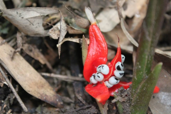- 被宿存苞片及萼片包著,熟時室背開裂,肉質胞壁深紅色;每室具種子多粒,橢圓形黑色,具墊狀白色假種皮,有偏斜條紋
