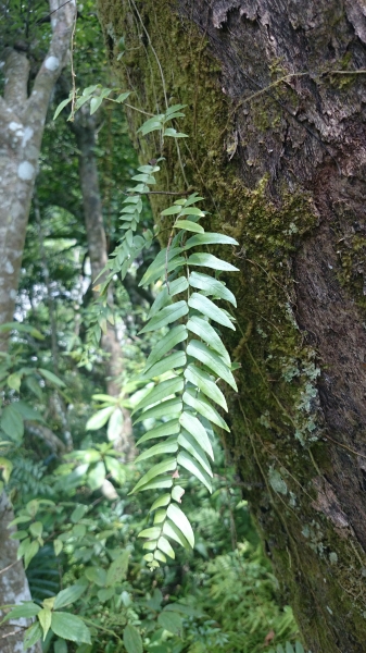 - 葉叢生短莖上,下垂,長 50~100 公分以上,一回羽狀複葉;羽片呈長披針形,長 0.8~18 公分,寬約 2 公分,基部楔形,不具耳狀突起,羽片基部與葉軸不重疊,葉表邊緣有泌水孔;葉脈游離,羽片側脈 1~2 次分叉,未達葉緣