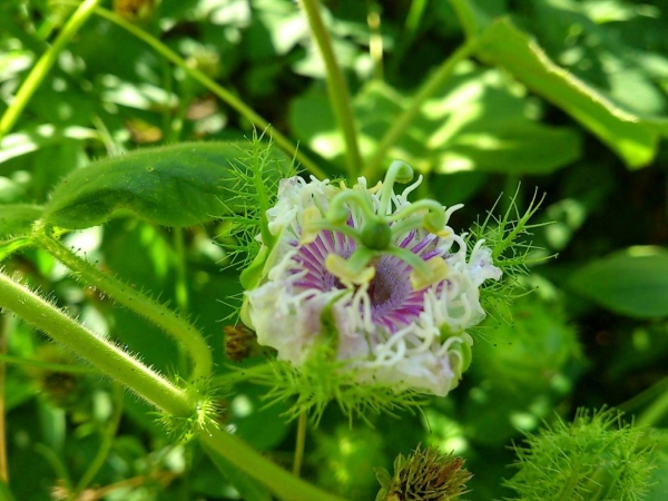 - 花單生,從葉腋長出,不具香味,白色或近似白色;苞片 3 枚,綠色,二回羽狀絲裂,殘存;花瓣 5 枚,白色長橢圓形,先端鈍;副冠呈絲狀的環狀,基部紫紅色,先端白色
