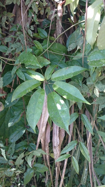 - 掌狀複葉互生,,小葉 3~7 片,革質,小葉片長圓形或長卵圓形,先端短漸尖,基部圓形,全緣,稍革質,葉面平滑,下面粉白色,有明顯斑點