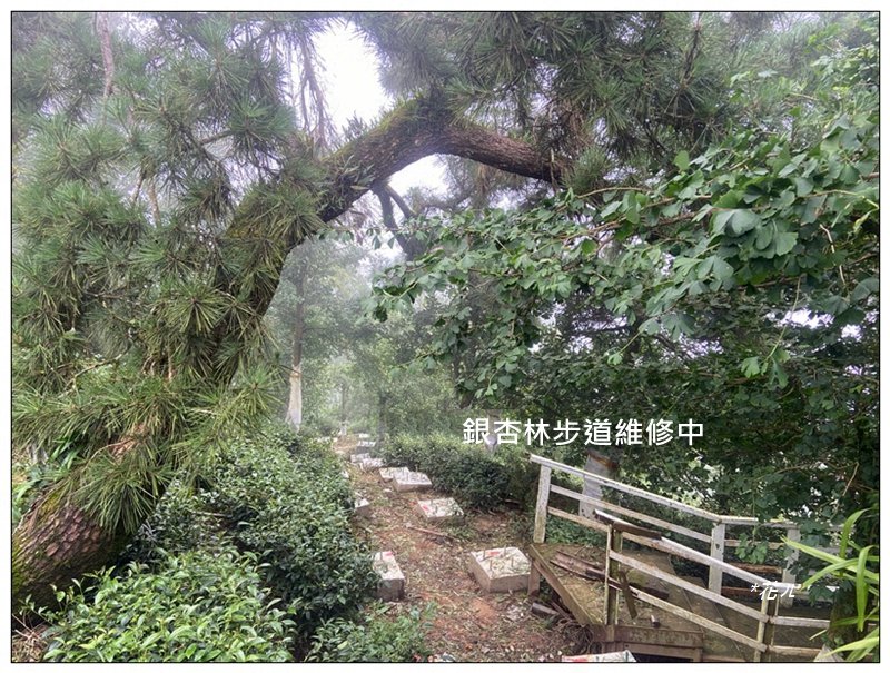 武岫農圃旁銀杏林步道維修中,近午易起霧嵐。