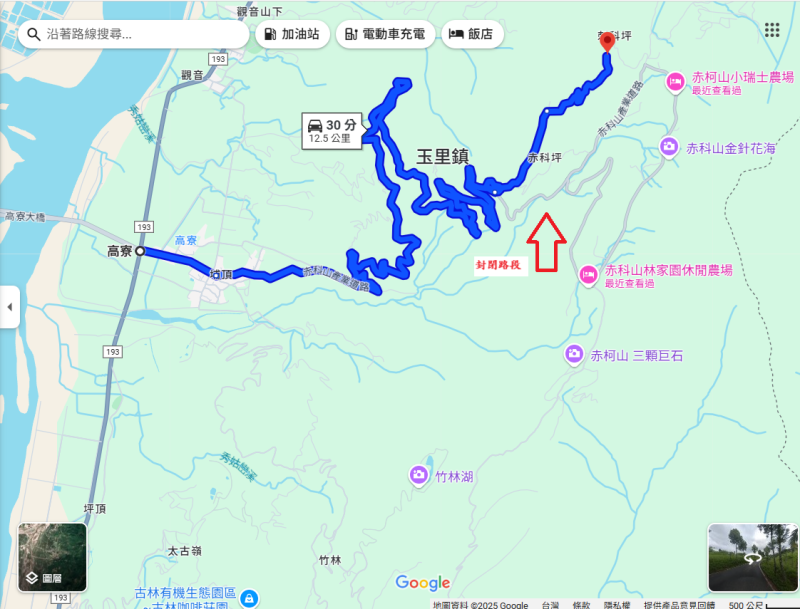 2025年花季期間接近福德祠路段尚在維修, 用google map導航小瑞士會引導由竹林路上山, 會被管制在山下; 建議目的地改設定赤科山小台灣, 由赤科山主線上山, 避開施工位置, 依沿途路線導引標示上山再由竹林路下山.