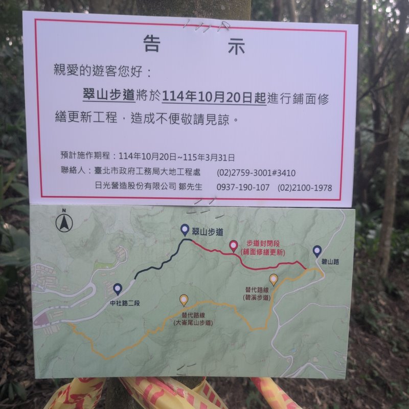 大崙頭尾山親山步道 步道狀況回報 2025-11-28 13:07 Yu Hui Yang 2025-11-28 回報 25.108827, 121.579539 0 0 大崙頭尾山親山步道 步道狀況 翠山步道鋪面修繕 114/10/20 - 115/03/31