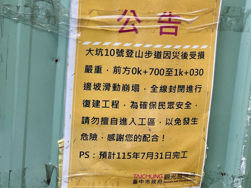 大坑9、10號步道 步道狀況回報 2026-01-12 14:17 蘇寶珍 2026-01-12 回報 24.180112, 120.733974 0 0 大坑9、10號步道 道路狀況 大坑10號步道整修中。