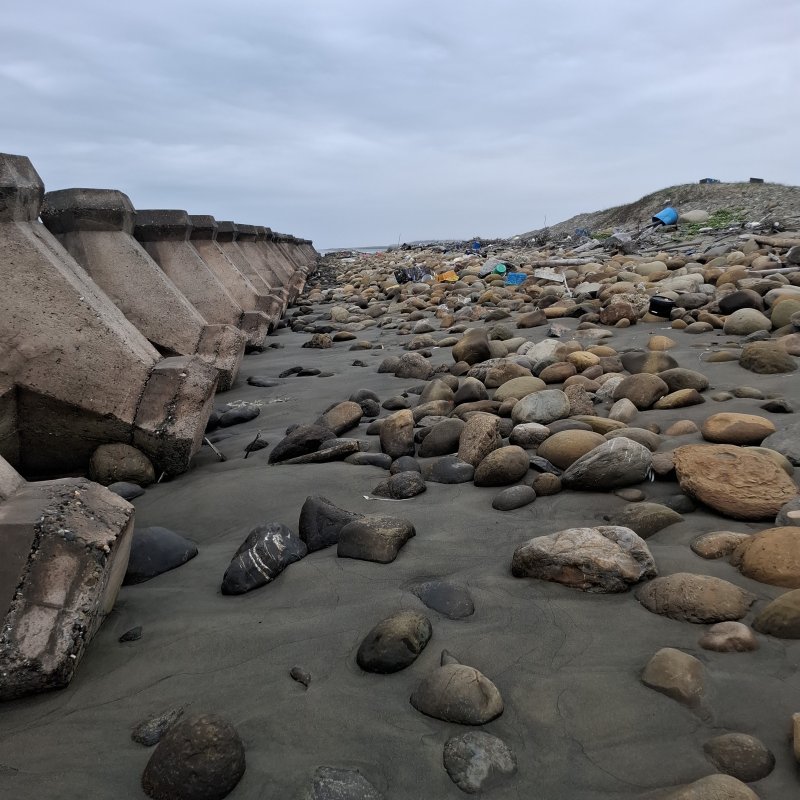 兩排消波塊及大石頭
