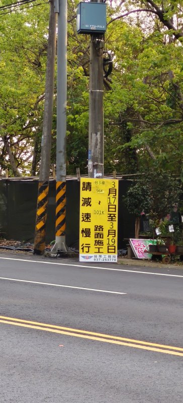 台三線96~101K,3/17~3/19路面施工,通行請注意!