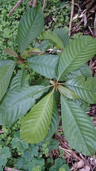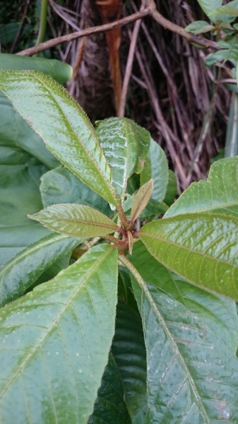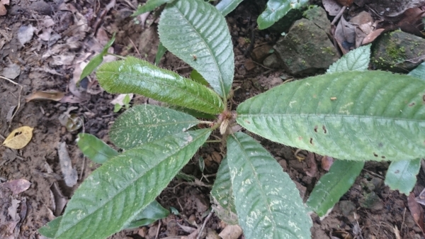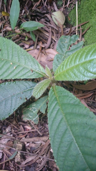 - 單葉,互生,具葉柄;葉片橢圓形至卵形,葉基尖銳,葉尖鈍形,葉緣具尖細鋸齒,表面有細毛,下表面沿中肋被剛毛,側脈 12~13 對,嫩葉呈褐色。