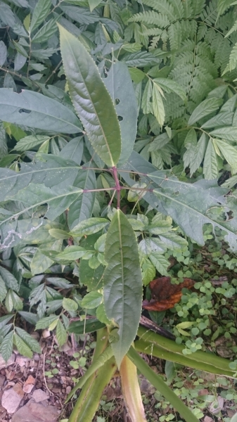- 單葉,對生,長橢圓至長橢圓狀披針形,大小變異大,長 8~12 公分,有實長可達 25 公分,寬 4~7 公分,先端漸尖或鈍,基部楔形,革質,有細鋸齒;表面呈有光澤的綠色,背面淡綠色;表裏兩面皆光滑無毛;中肋及側脈於表面凹下而於背面隆起;側脈每邊 7~8 枚,於表面凹下而背面隆起;葉柄圓柱形,兩端膨大且有關節,先端略屈曲,有時帶淡紫色。