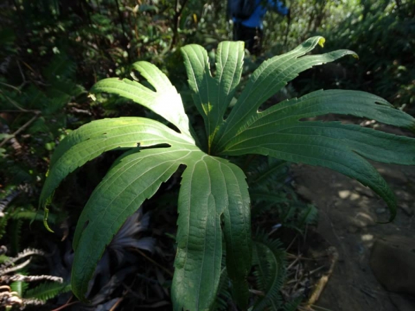 - 單葉,散生;葉柄長 30~60 公分,稻稈色,基部有鱗片,其餘光滑;葉片長 20~30 公分,寬 20~60 公分,二裂成相等的扇形,每扇再作多次深裂,各裂片長漸尖頭,疏粗鋸齒,主脈二叉分歧,主脈間有許多小網眼,網眼內有單一或分歧的小脈
