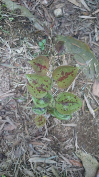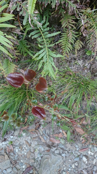 - 單葉互生,,葉基圓形、心形至楔形葉尖圓形,具 1 短尾突,主脈 3~5 條,全緣,硬革質,上下表面光滑;葉柄常彎折而屈曲,上有兩根由托葉變形而成的捲鬚,葉面青綠,三出脈於葉下凸起