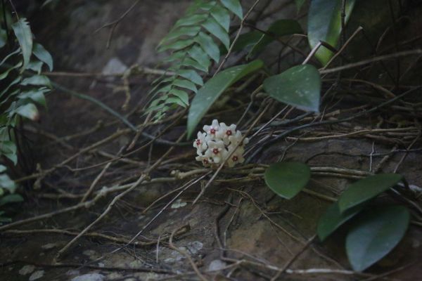 - 繖形花序,呈球狀開展,自葉腋處發出;花肉質,具長梗,乳白或灰白,但花心淡紅色,徑約 1~1.3 公分;花萼 5 裂,外部有毛,花冠上面亦密布絨毛,副花冠呈 5 裂而有光澤;花粉塊直立